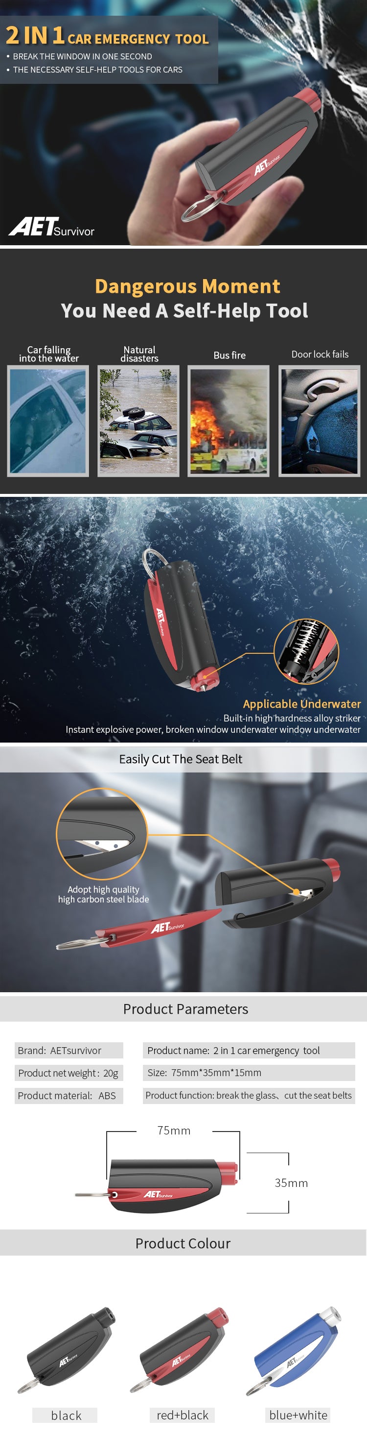 - Function: Break the glass, Cut the seat belts